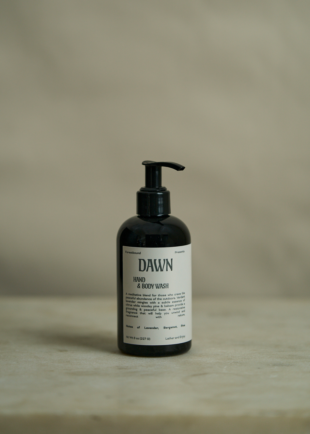 This project involved package design for their new bath and body collection — including a room and linen spray, a body oil, and a hand and body wash. The objective was to create labels that felt cohesive with the already established Forestbound brand but deliberately avoided its primary identity assets. The solution resulted in a strong yet simple type treatment set against a solid flat color, providing a distinct and elegant look.